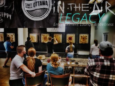 In The Air - LEGACY serves an incredible selection of craft beers, cider, local, and mixed drinks. The only Licensed bar to have knife throwing, axe throwing, In The Air Gun Ultra shooting, we pioneered the experience and nailed it out of the gate!